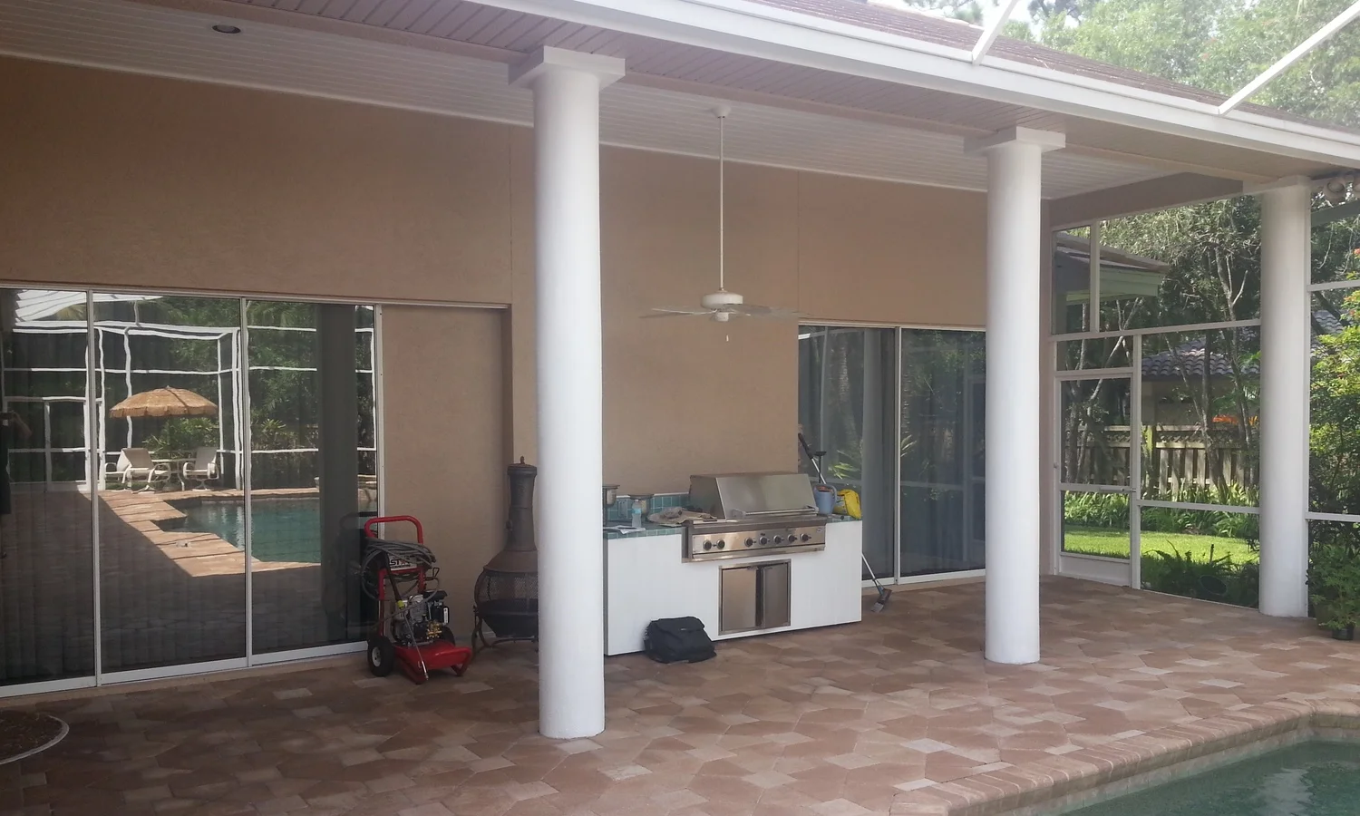 The old outdoor kitchen was outdated with turquoise tile counter tops and a white stucco base. There was not much room to prepare food and the grill was old. At first visit we saw the potential in the space for a beautiful, spacious, U-shaped outdoor kitchen & bar.